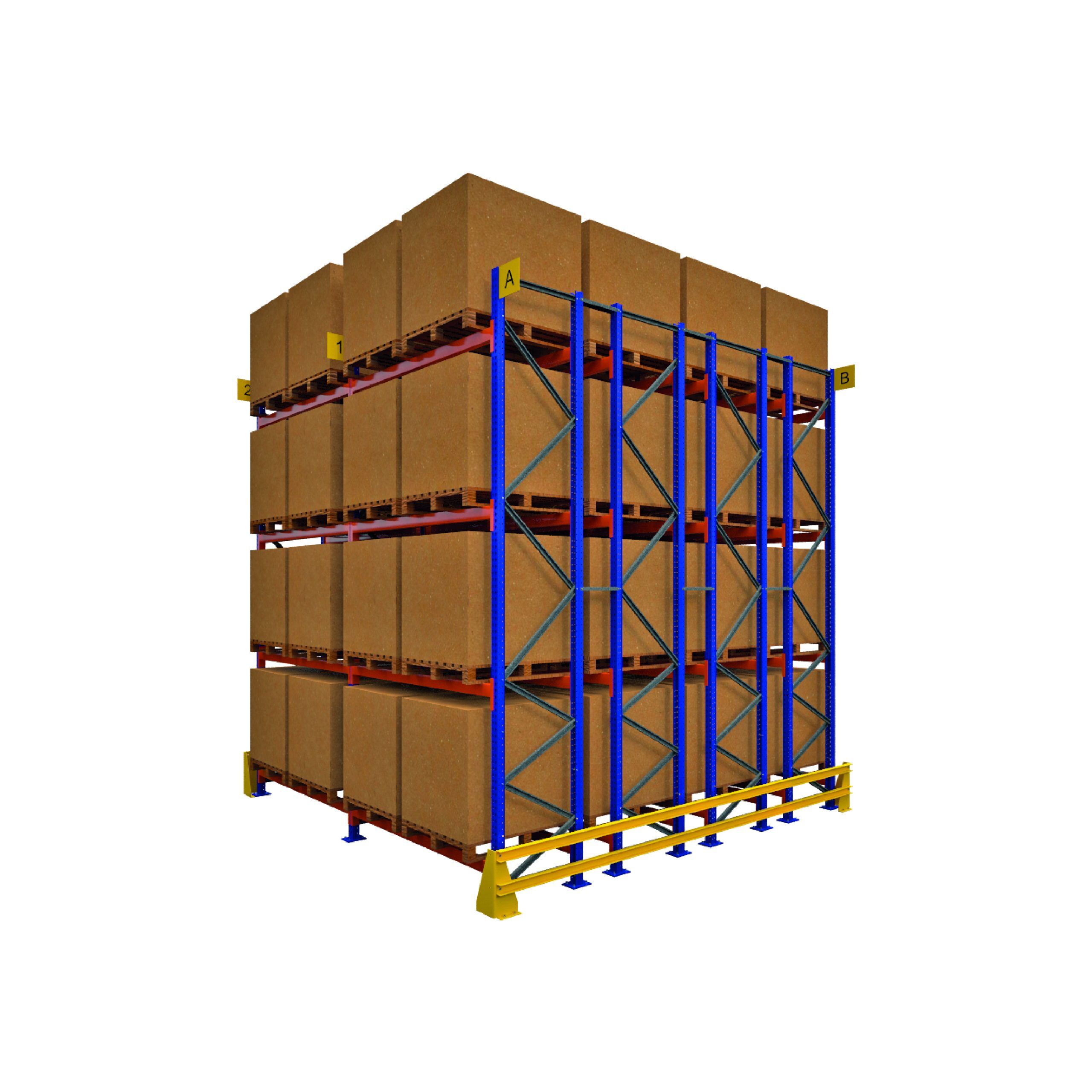 Este te ayudará a reducir el número de pasillos requeridos hasta en un 60%, optimizando áreas disponibles y aumentando la capacidad de almacenaje, teniendo como único requisito la utilización de un equipo de montacargas que posea pantógrafo o extensión para lograr el doble alcance, necesario para llegar a la segunda tarima de fondo.